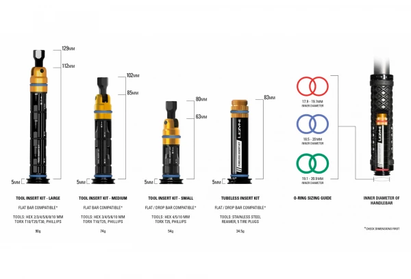 Le kit est facilement accessible pour des réparations rapides et est livré avec cinq différents outils. Il sert également de bouchon de cintre et est livré avec trois joints toriques de tailles différentes pour assurer un ajustement parfait à votre guidon.